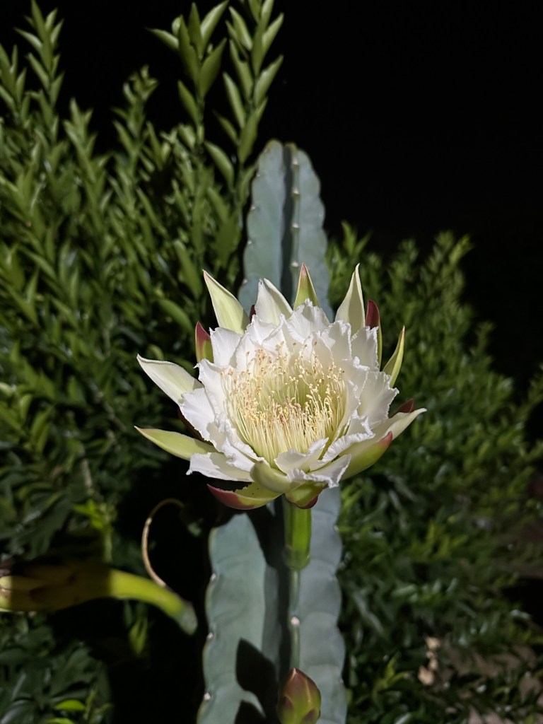 As flores desses cactos se abrem ao anoitecer — algumas logo que começa a escurecer e outras um pouco mais tarde — e se fecham assim que o dia clareia ou quando o sol começa a incidir sobre elas.